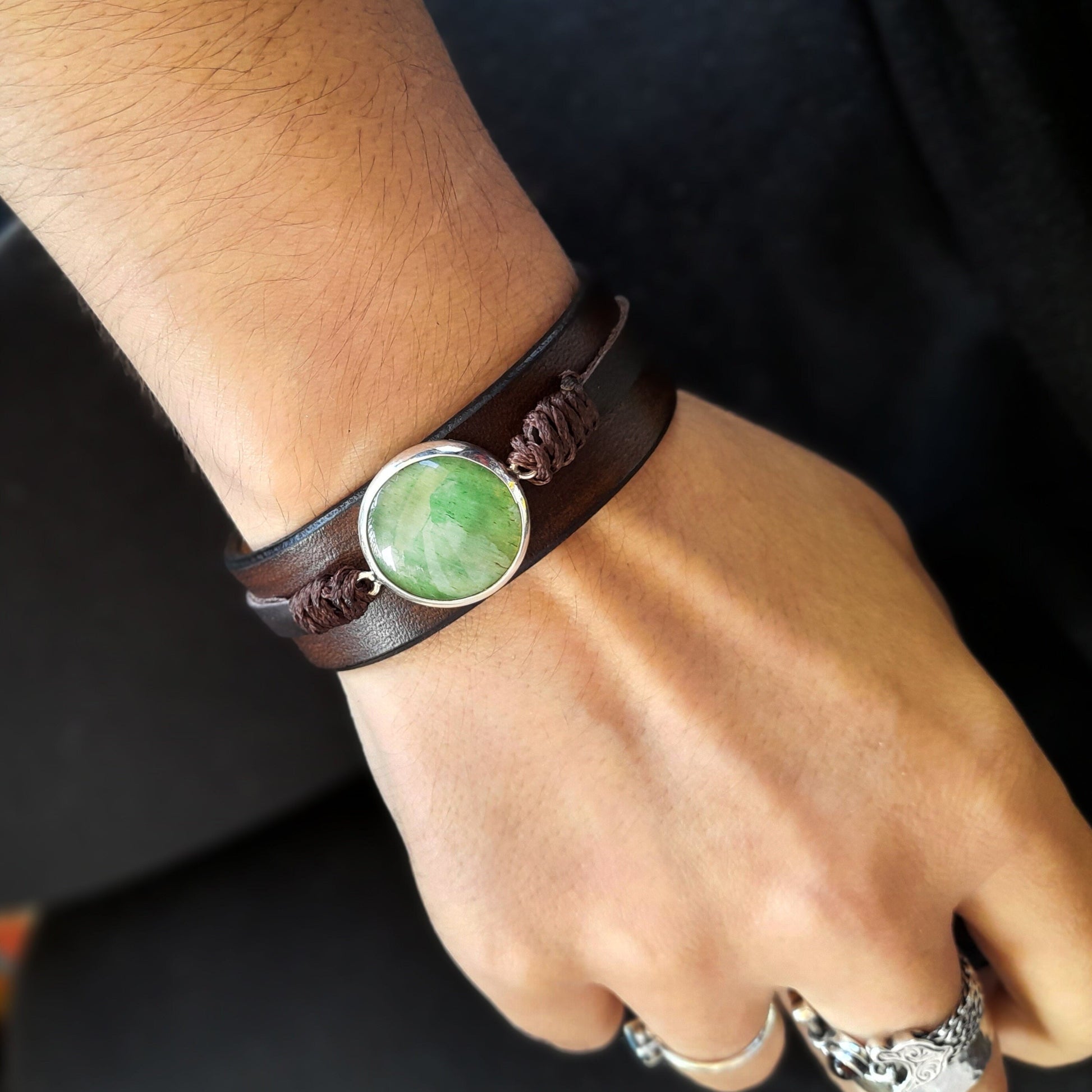 Grand bracelet en aventurine verte naturelle, argent 925