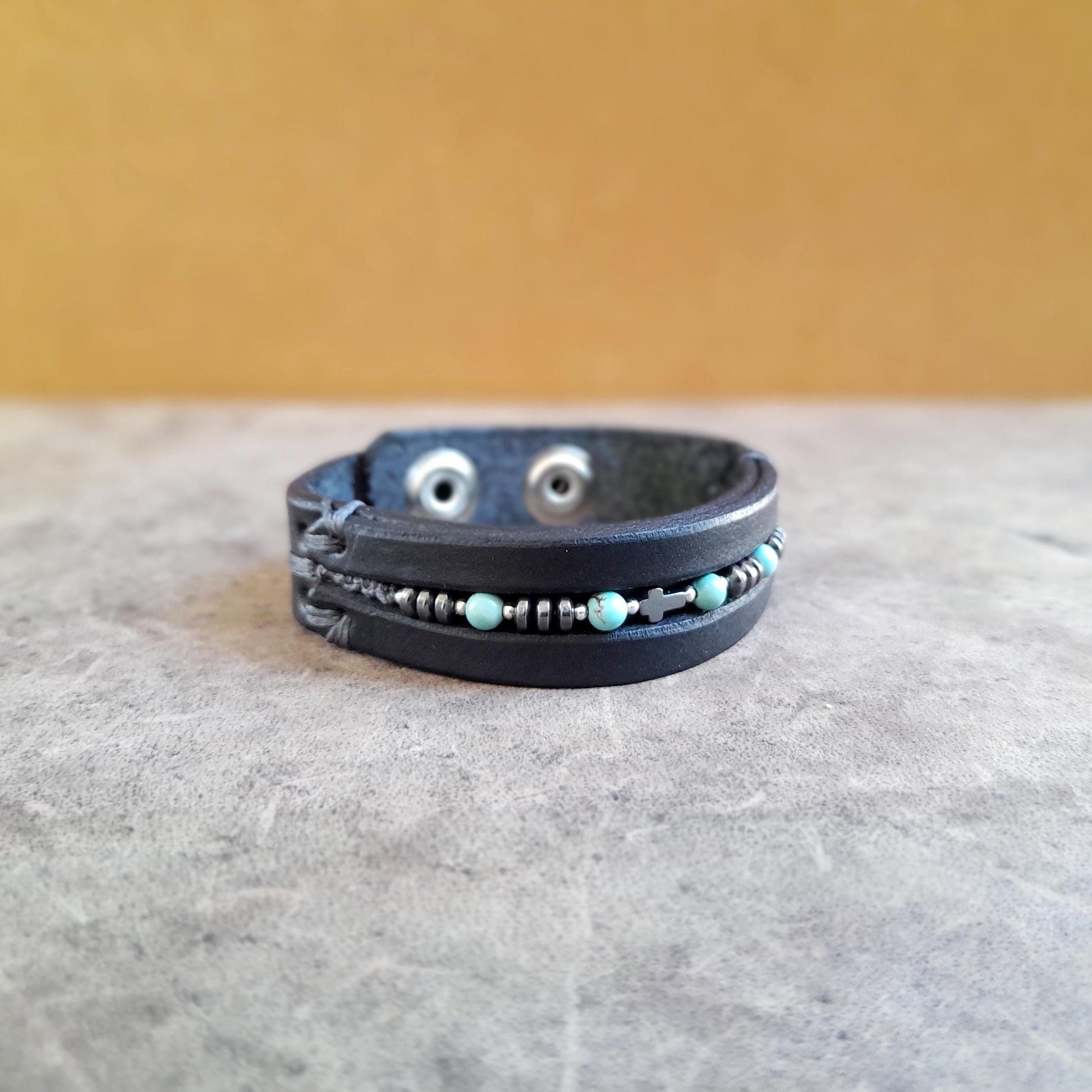 All Black Leather Bracelet for Men in layered design and edgy style. Made of black oiled vachetta shoulder (shoulder), featuring a row of Hematite and Natural Turquoise Beads, with a tiny Hematite cross in the middle.