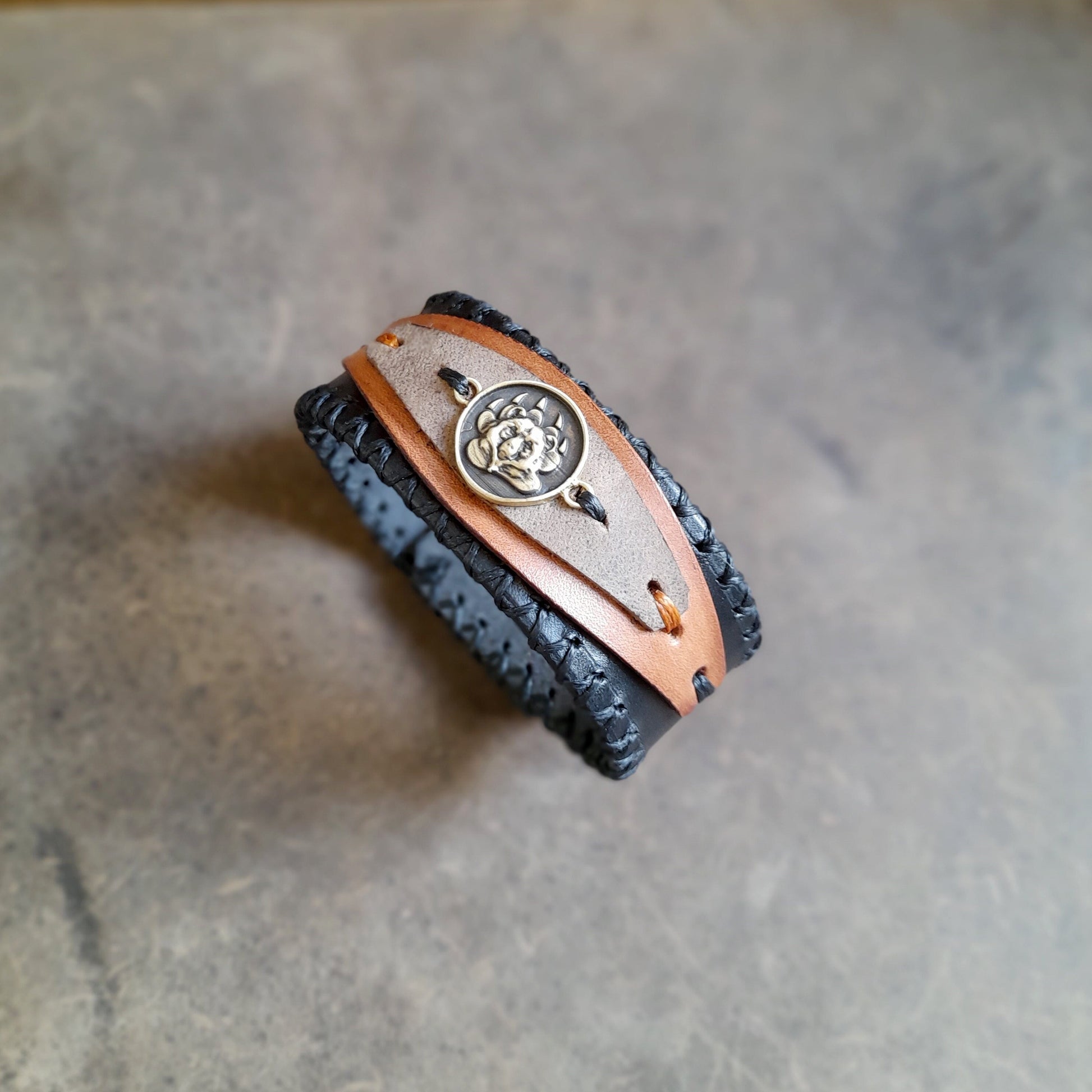 Bear Leather Cuff for Men made of three different leather pieces, featuring a handmade brass Bear charm.