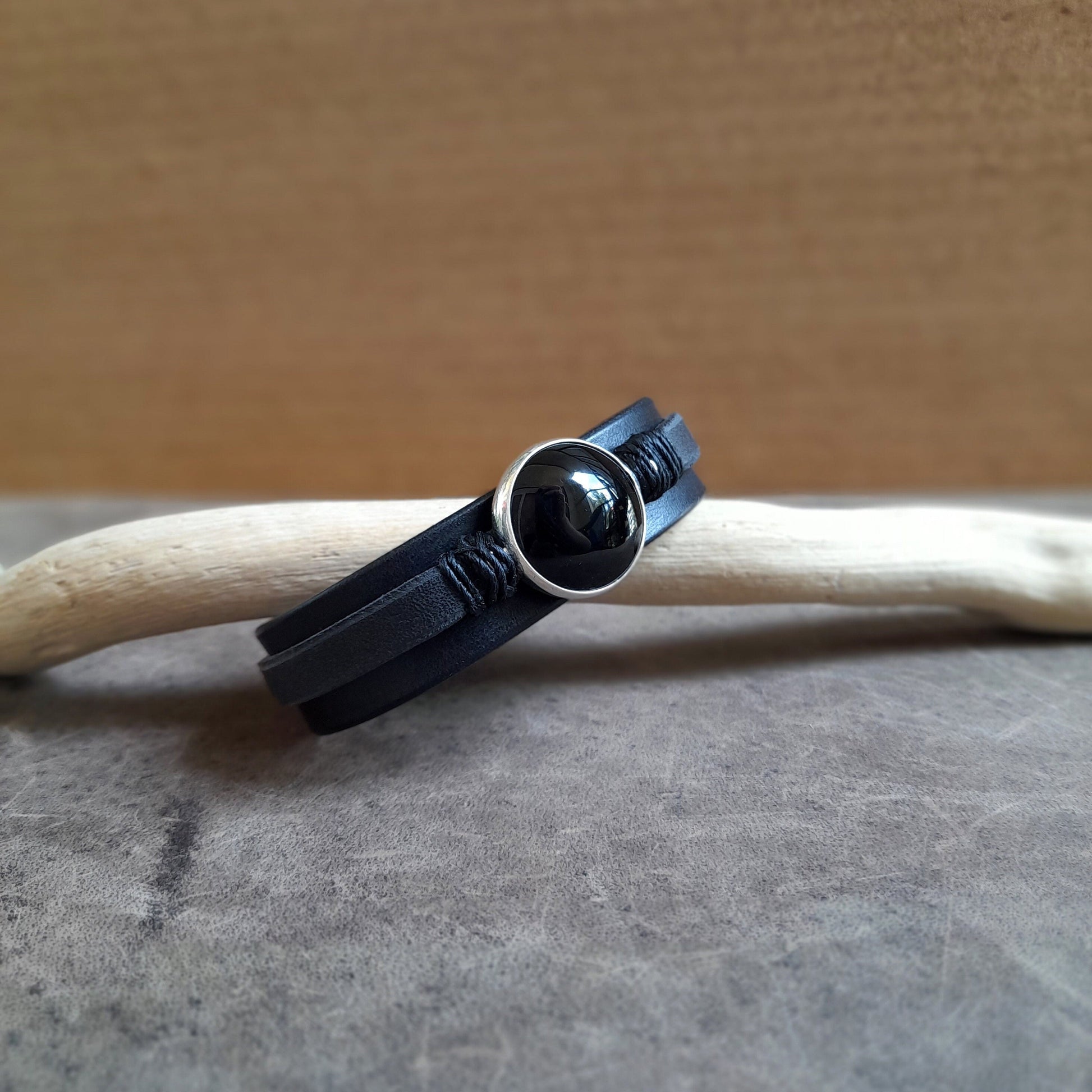 This one of a kind handmade leather bangle is made of two layers of full grain leather and features a hand crafted sterling silver pendant with a large black obsidian stone.