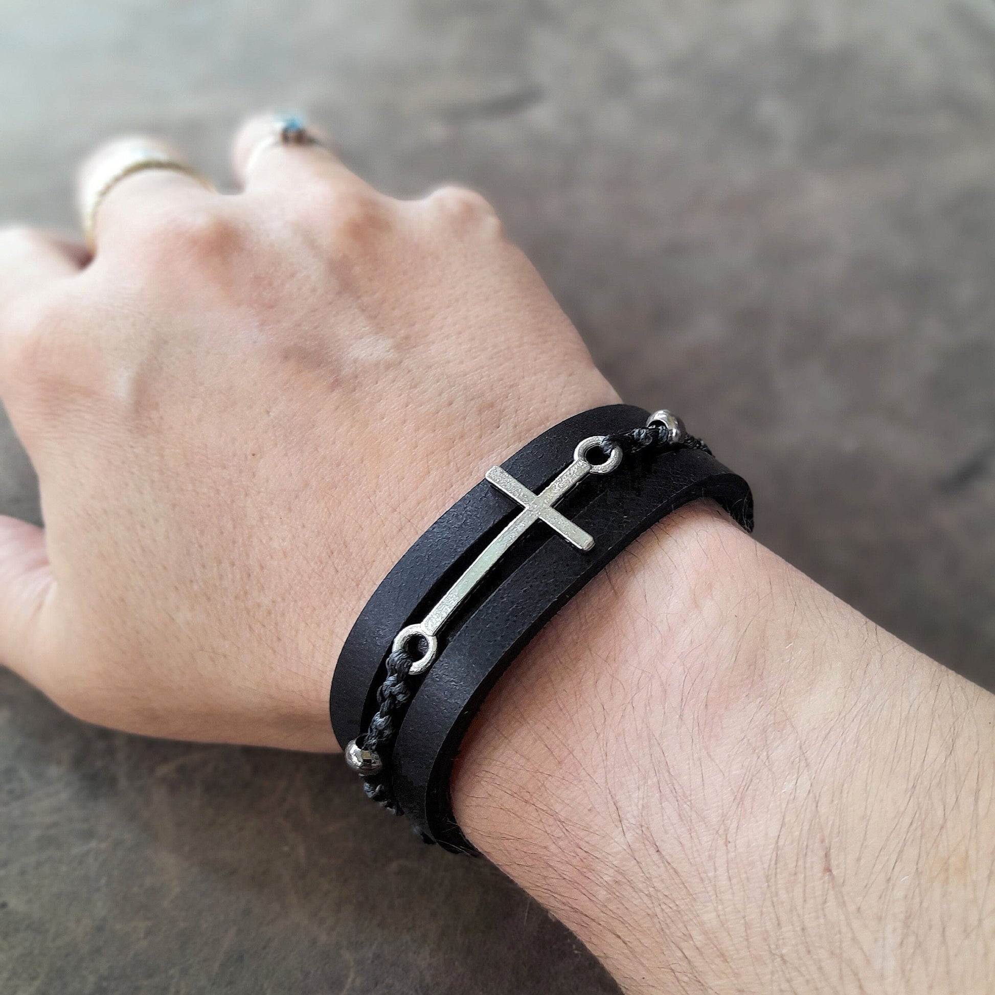 This piece features a combination of Black Leather, Macrame, Hematite Beads and a Sideways Silver Cross, making it a remarkable jewelry item and an ideal gift for him.
