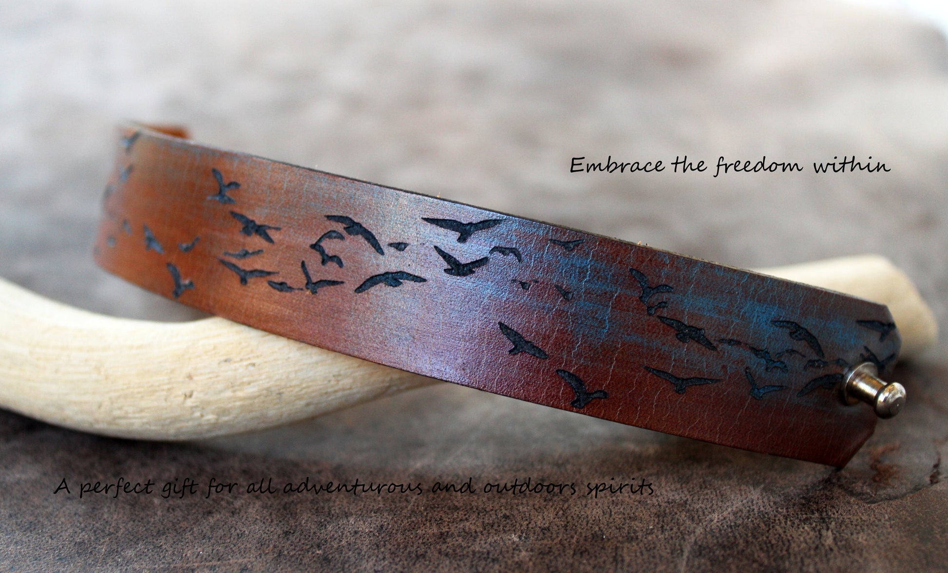 Blue Sky Birds Leather Bracelet: Leather Cuff Bracelet with deeply laser engraved birds on a night sky, a perfect gift for all adventurous and outdoors spirits. The discreet shades of blue add a beautiful tone, while several layers of high quality leather sealant provide maximum sturdiness and durability, as also a significant water resistance (however, avoid excess exposure on water for maximum longevity).