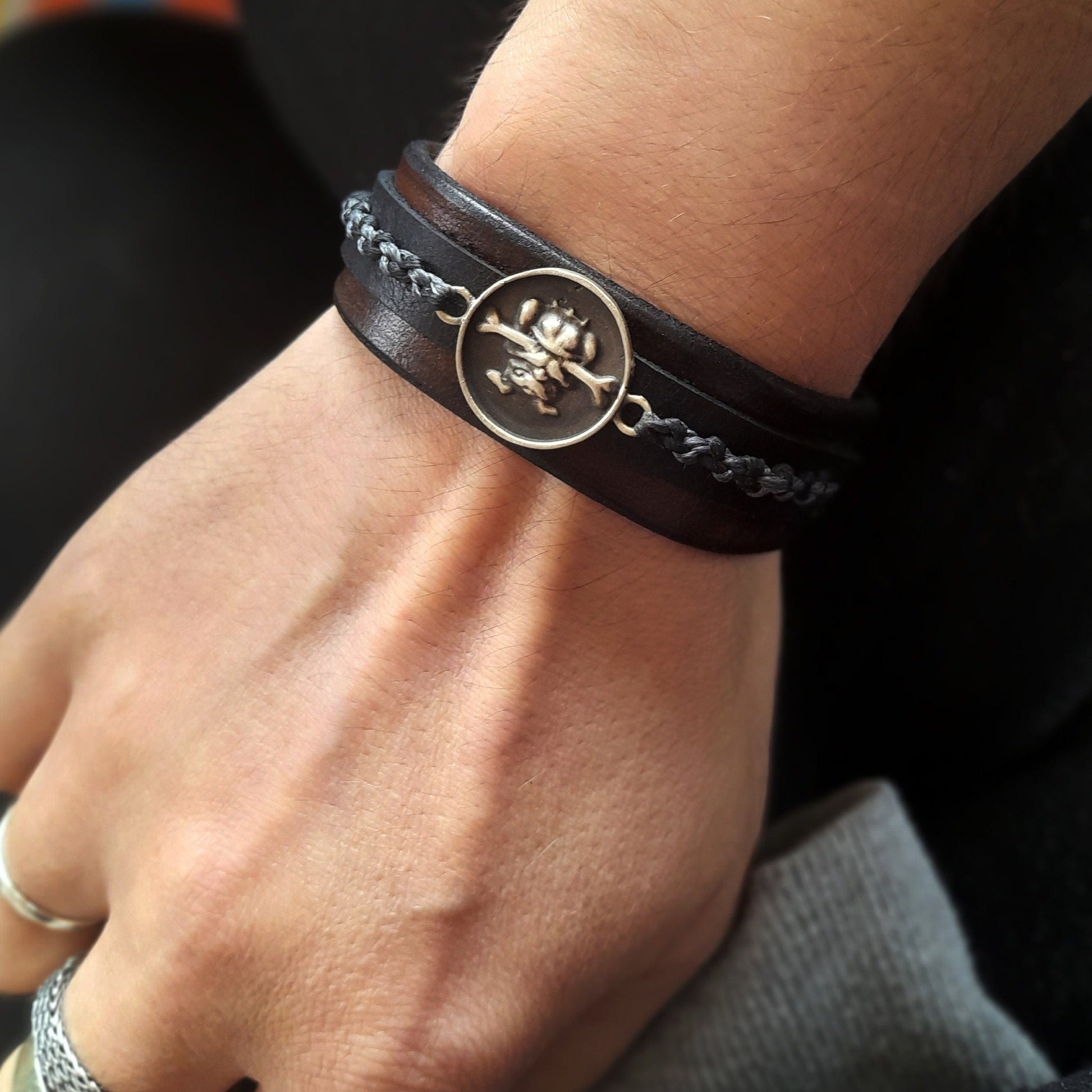 This beautiful and edgy bracelet is made of two layers of sleek full grain leather in chestnut brown and black hues, featuring a handmade oxidized brass bulldog pendant.
