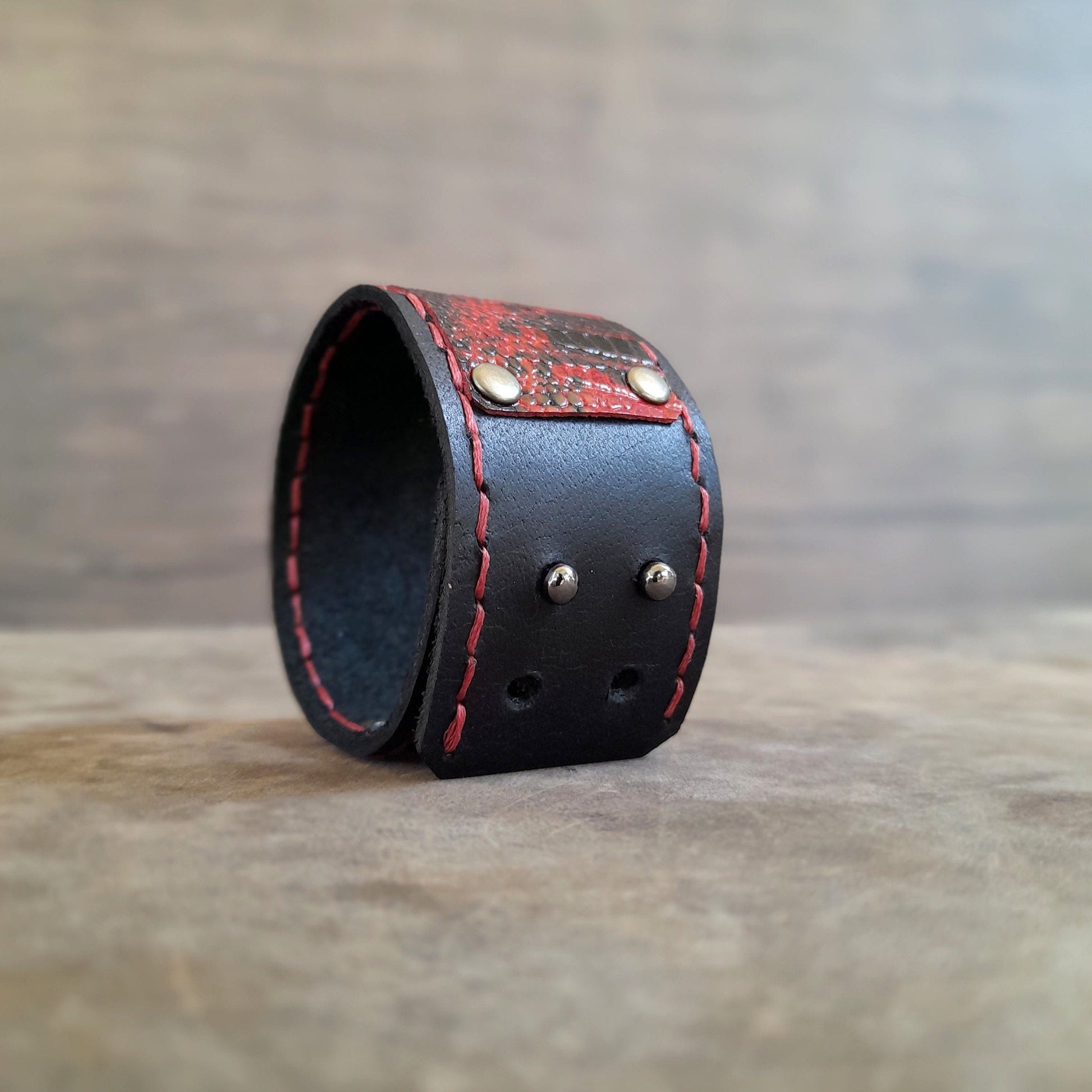 This stylish Extra Wide Snake Skin Print Leather Bracelet features a captivating snake print design in striking red and black hues, exuding a bold and edgy vibe. Crafted from premium black full-grain leather, this cuff ensures durability and comfort, making it a go-to accessory for any occasion.