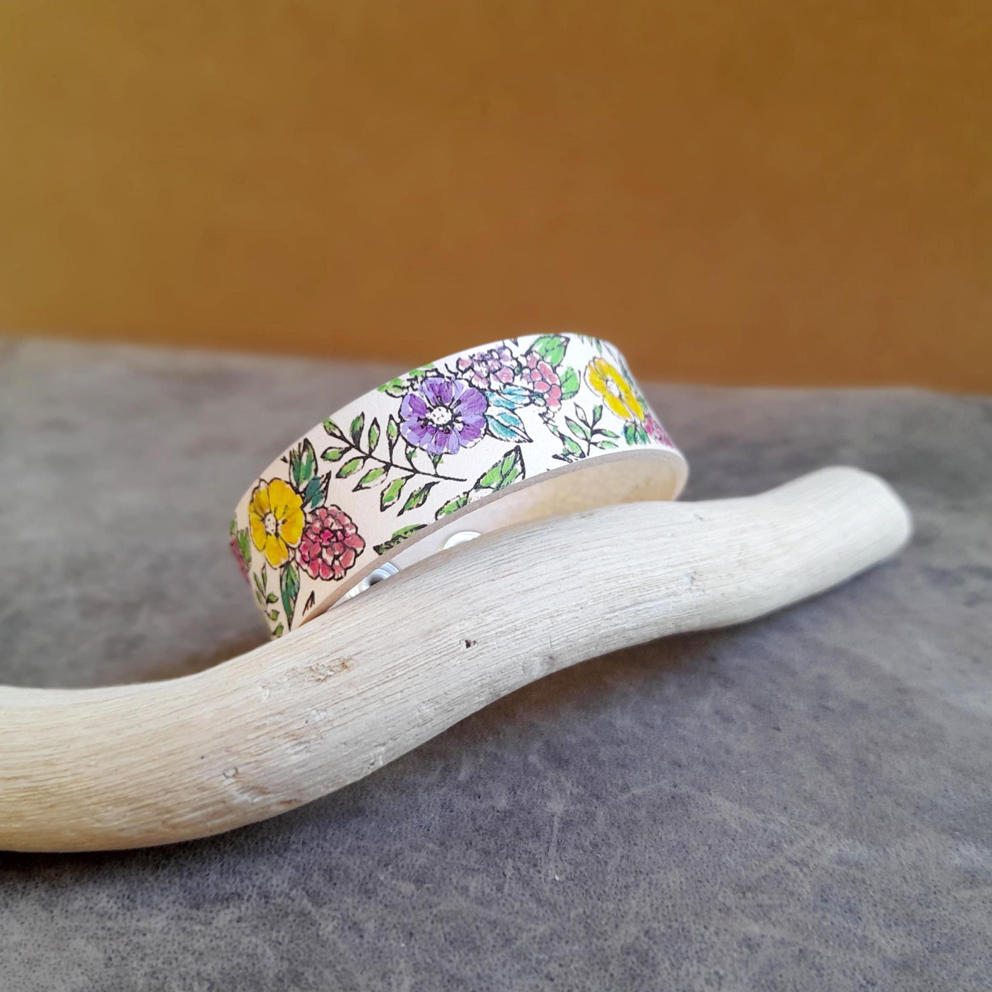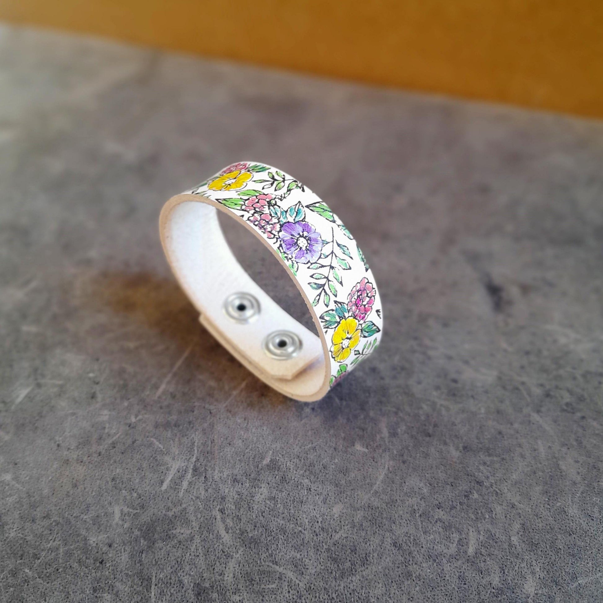 This hand painted floral leather bracelet is made of creamy white vachetta leather and decorated with hand painted pink Carnations, Violets and yellow Primroses.