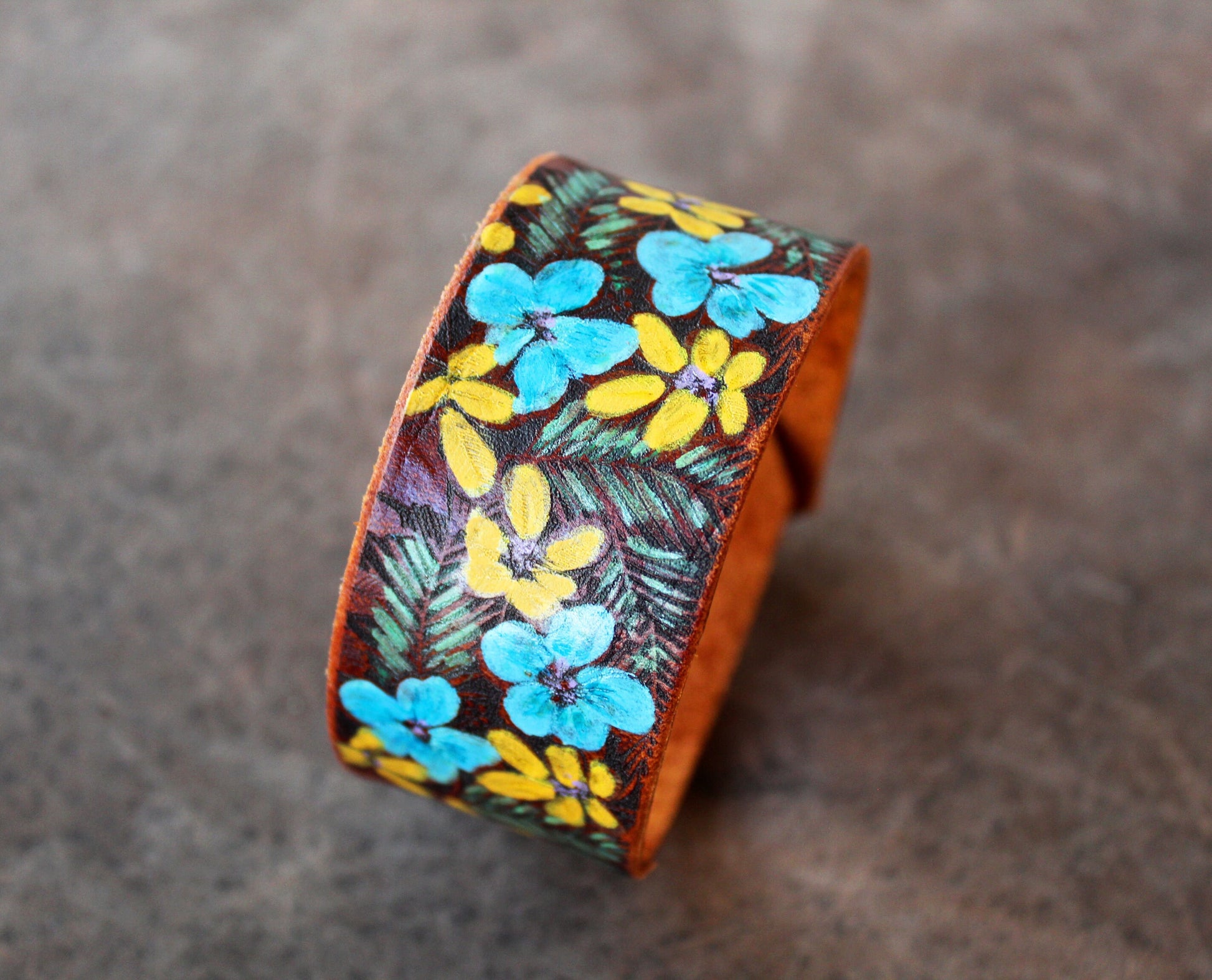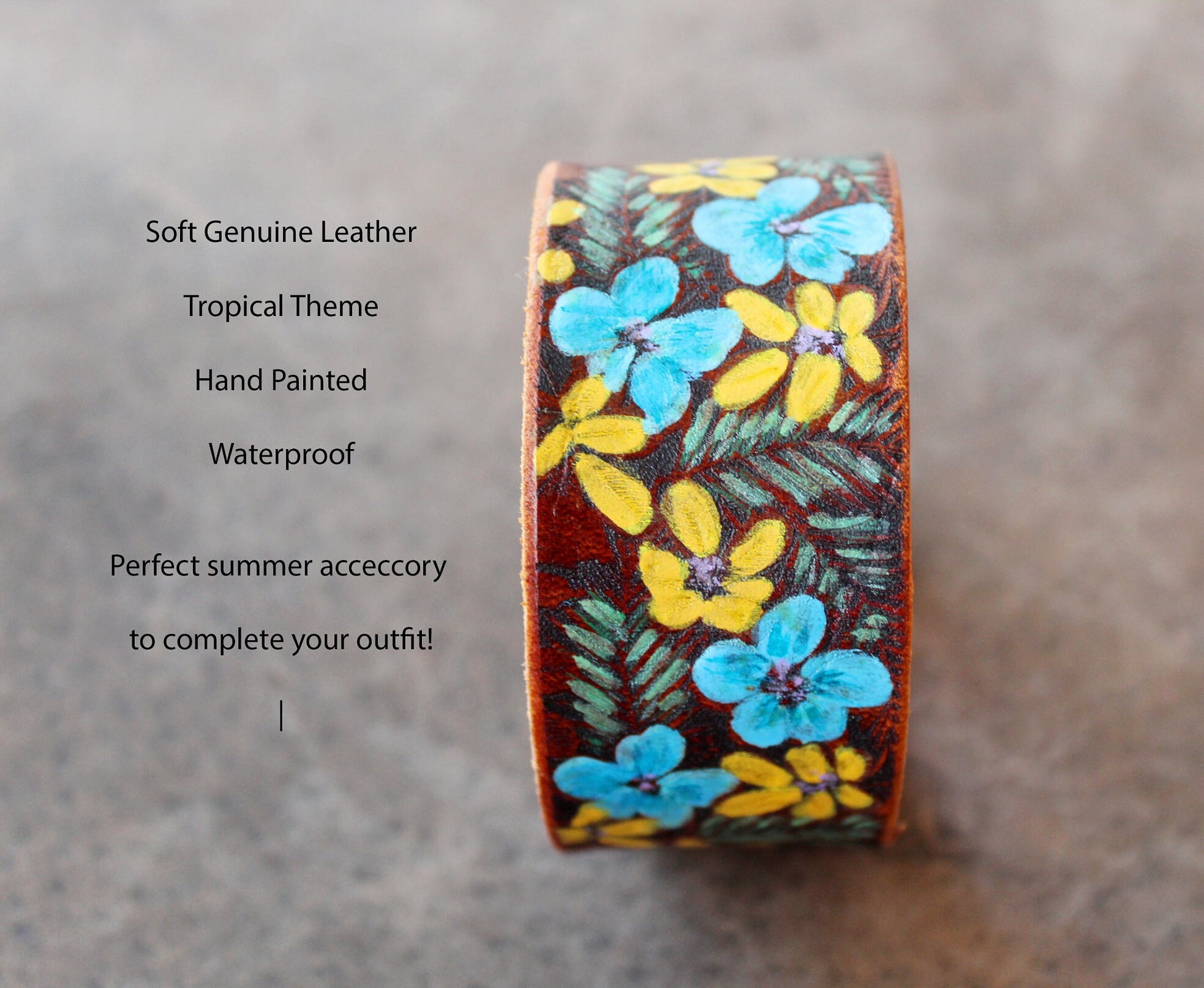 Hand Painted Tropical Flowers Leather Bracelet - a beautiful handmade leather cuff, soft, lightweight and with a comfortable fit, a perfect accessory to complete your summer outfit - even that means wearing only your swimsuit.