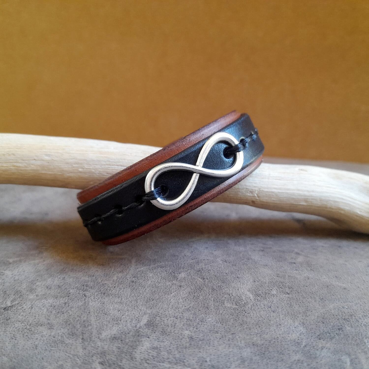 Handcrafted with intention, this design features a double-layered leather band: a sturdy foundation of rich brown full grain leather, overlaid with a sleek strip of black Crazy Horse leather. The contrast creates depth, while the central silver infinity charm acts as your personal symbol of continuity and unity.