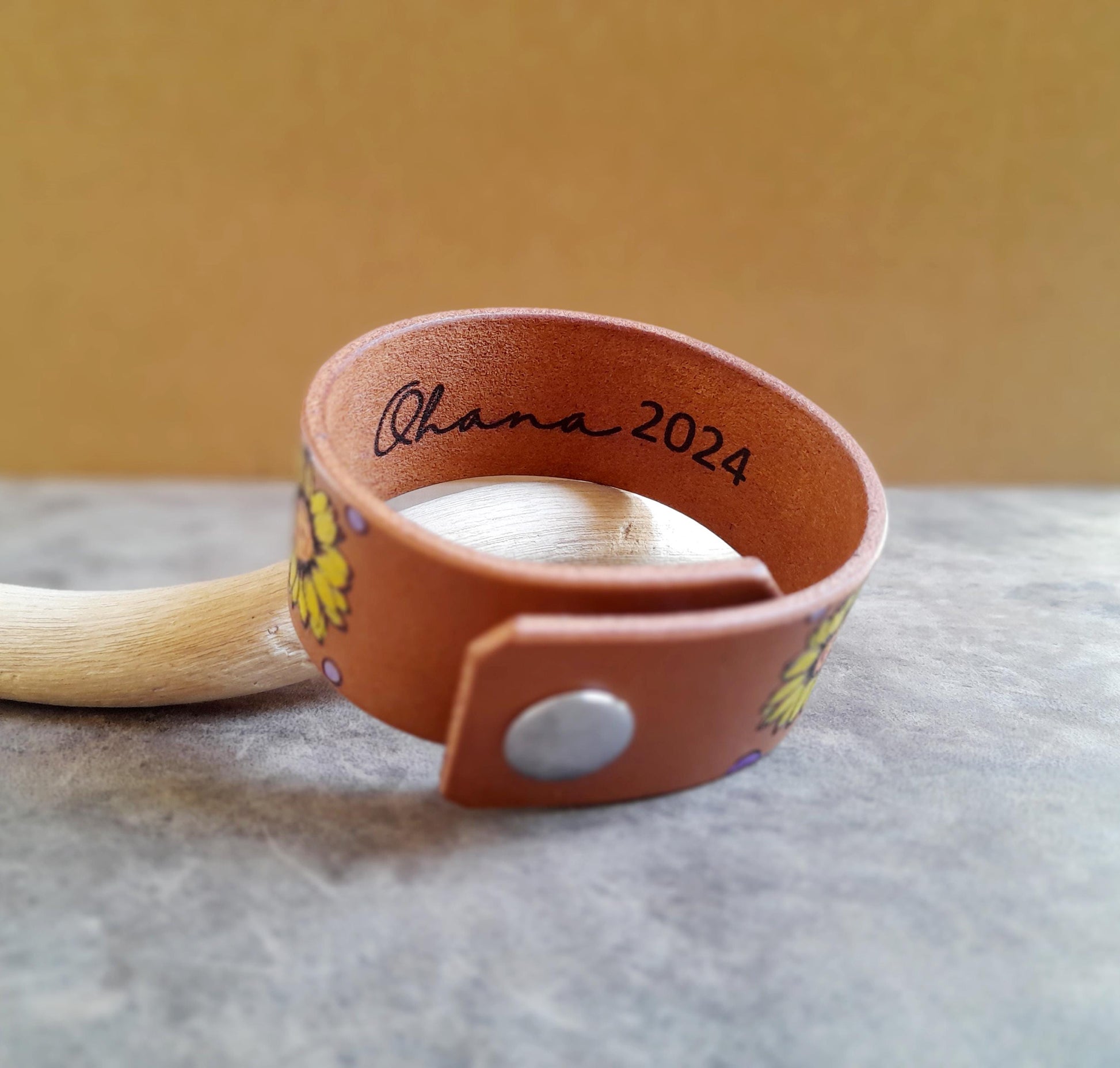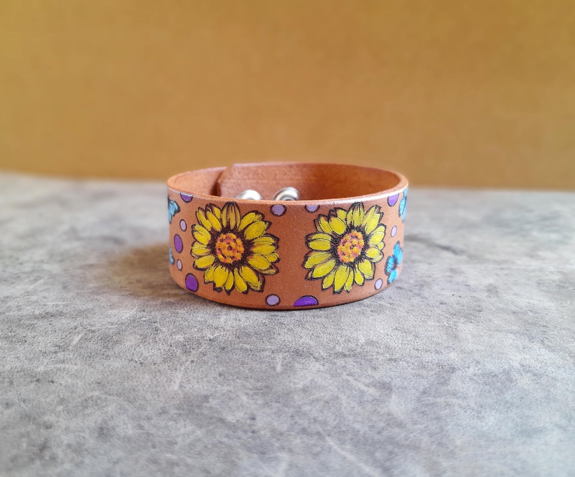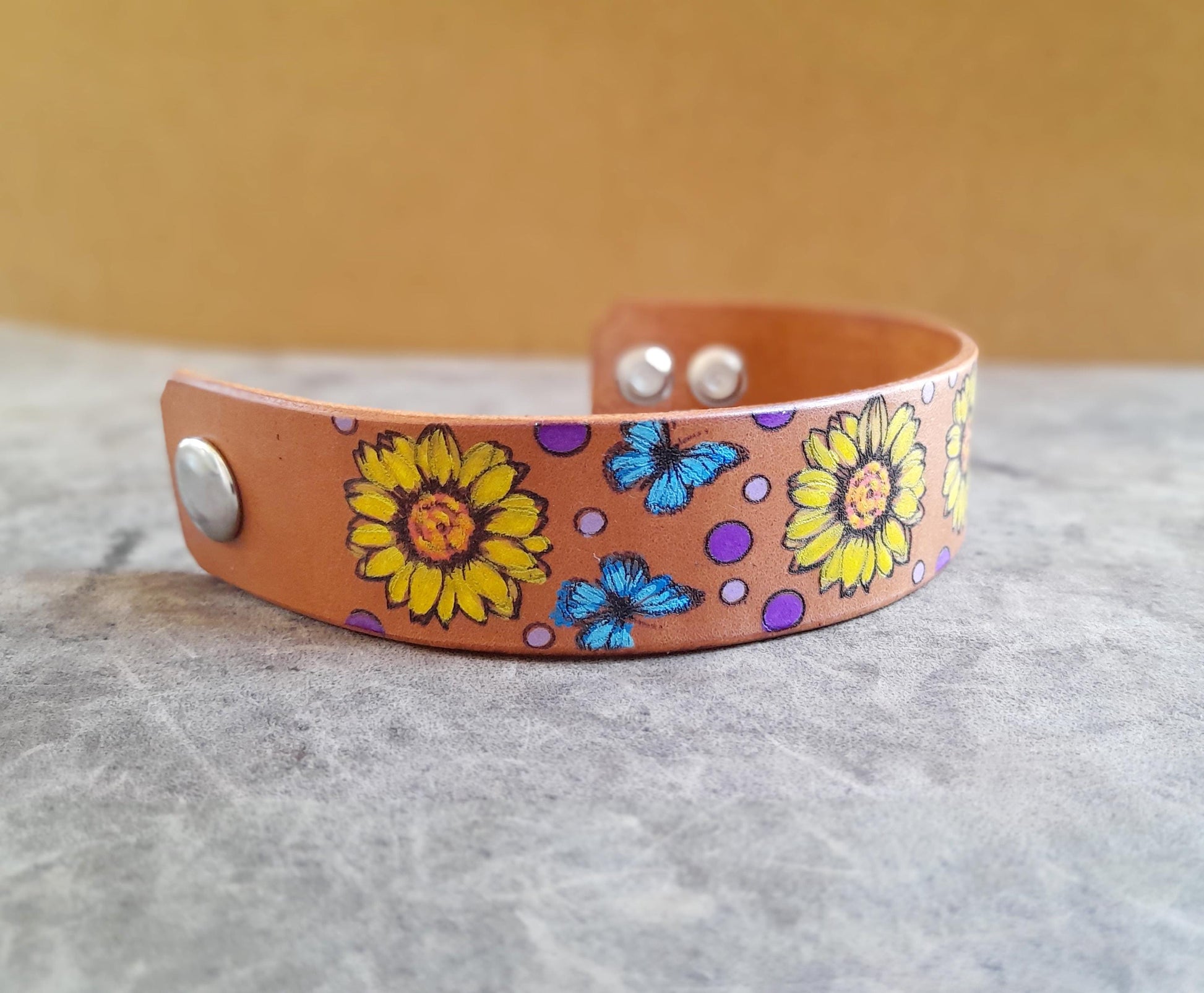 Carry Spring on your wrist and send positive vibes around you with this cute Yellow Flowers and Butterflies Bracelet that you can personalize optionally with your best motto. Deep engraving and hand painted large yellow daisies and tiny happy butterflies, several layers of leather sealant for durability and water resistance, make this bracelet suitable to wear all day wherever you go!