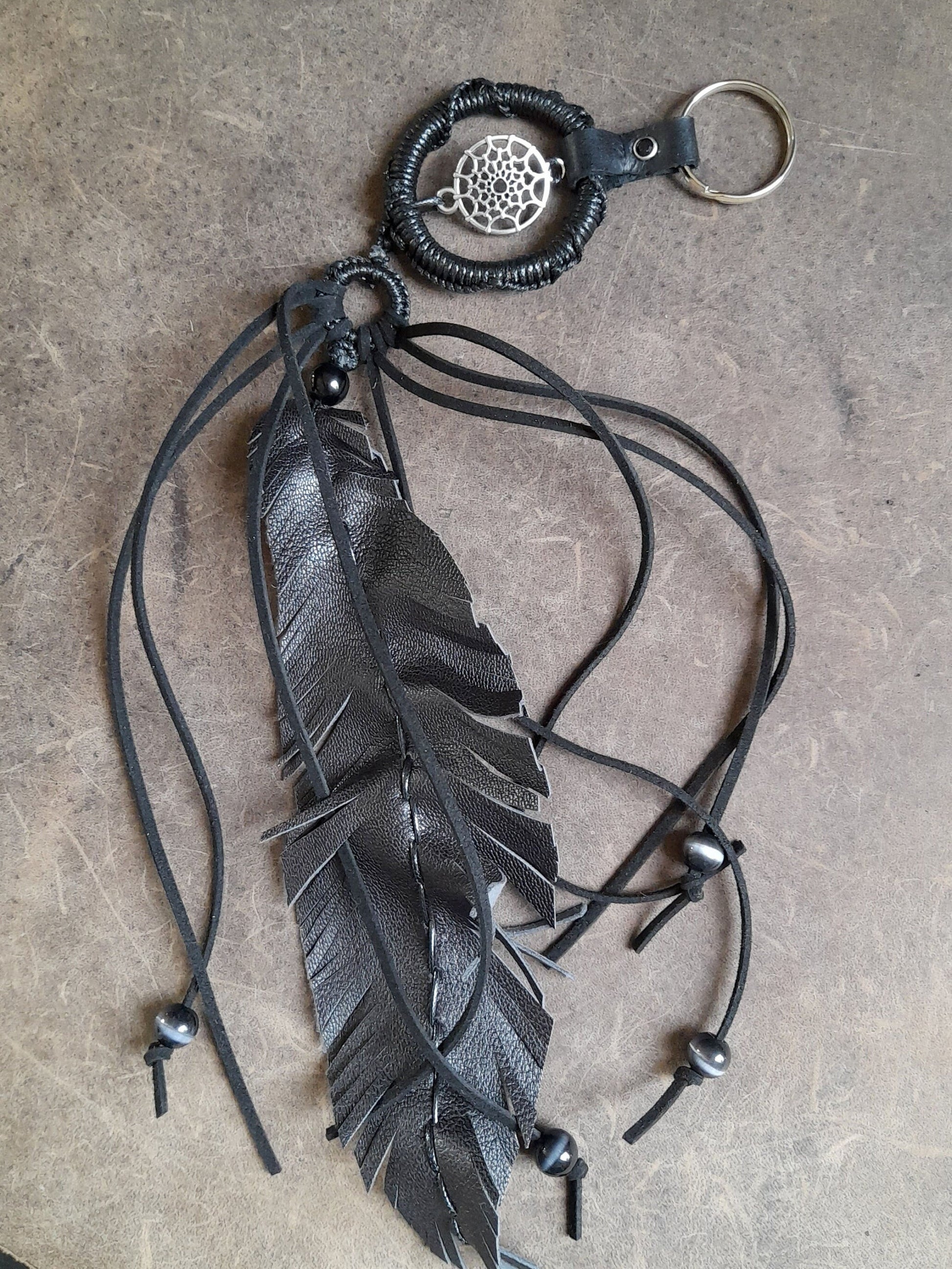 Long Leather Feather Bag Charm with Black Fringe and Silver Dreamcatcher